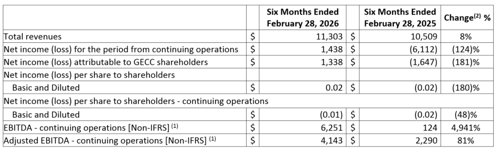 “Our second quarter financial results for fiscal year 2026 were marked by the successful divestiture of the Company’s legacy educational assets and a steady increase in student housing revenue,” commented Toby Chu, Chairman, President and Chief Executive Officer of GECC. The following is a summary of the Company’s financial results for the six months ended February 28, 2026 (“2026 YTD”):
